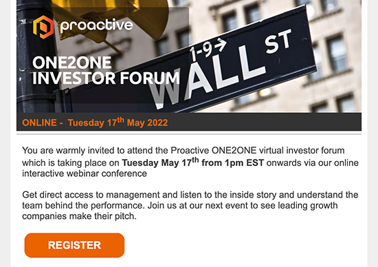 Proactive ONE2ONE virtual investor Tuesday May 17th from 11:00am PST/2:00pm EST