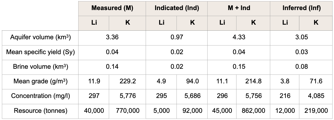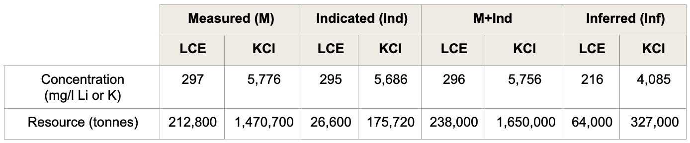 - Measured and Indicated Resources of 0.15 km3 brine volume with an average grade of 296 mg/lithium, representing 238,000 tonnes Lithium Carbonate Equivalent (LCE), and